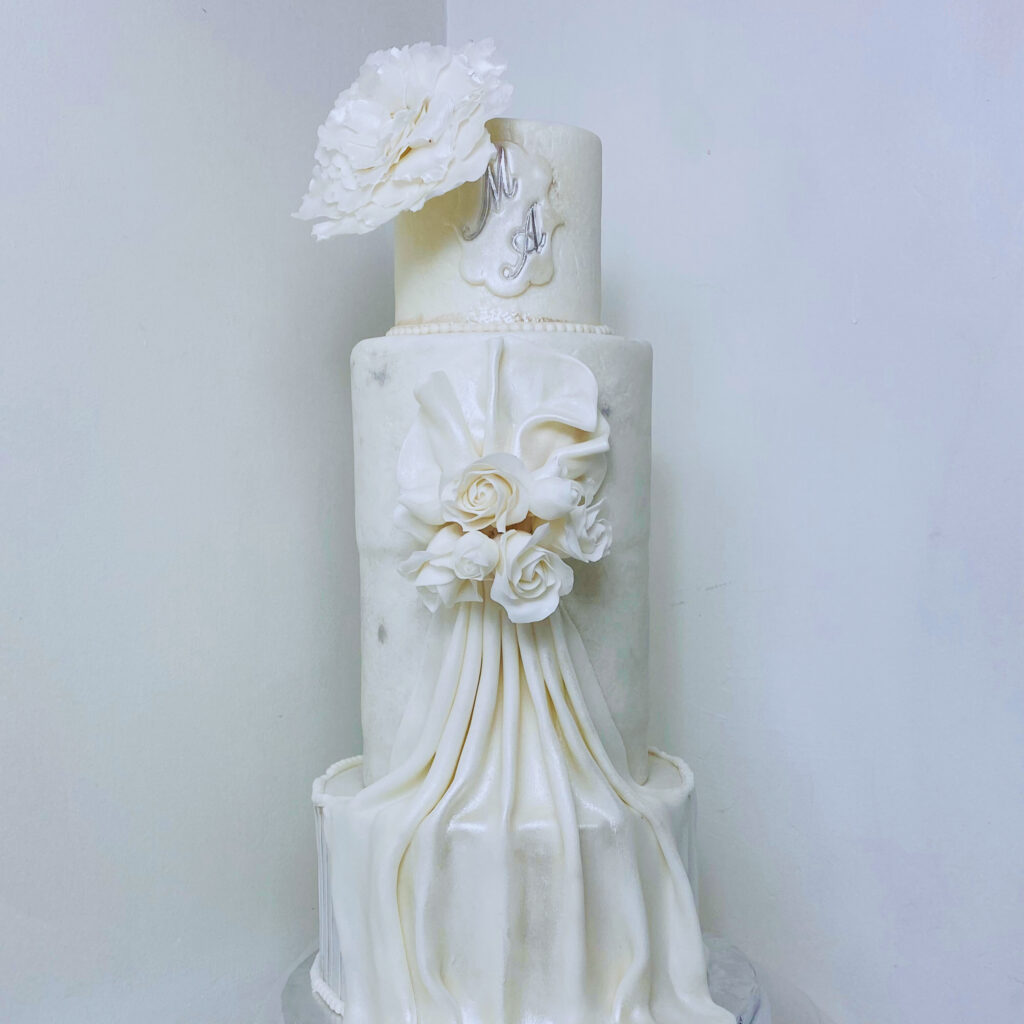 🎉 Vivent les mariez 🤵♂️👰♀️ 🎊 !!! Idéale pour vos mariage à thème éclat d’Or. Voici mon Wedding Cake à 3 étages, glisser au milieu des pierres d’or fait à la main et décorer de fleur aux reflets d’Or fait à la pâte à sucre.